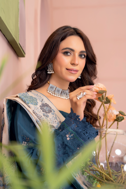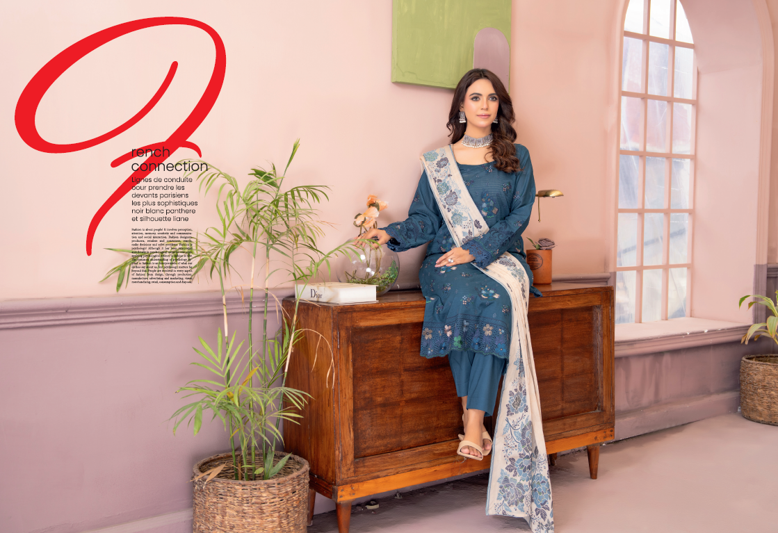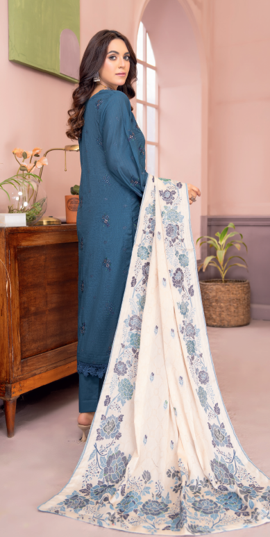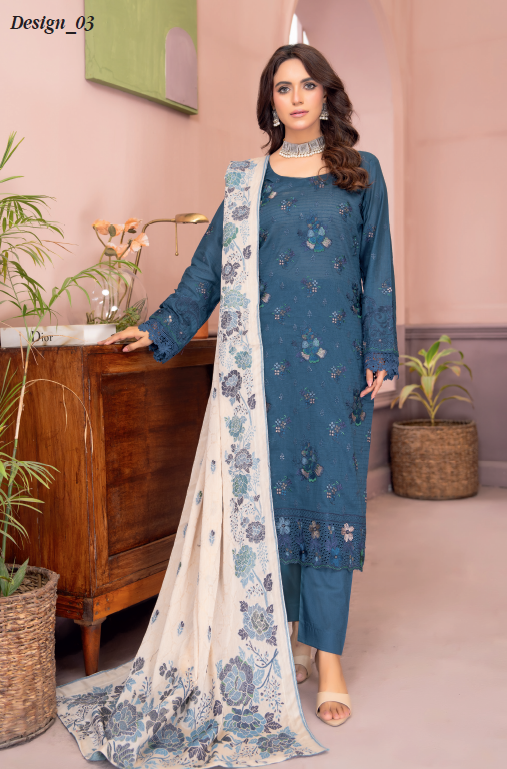 A premium three-piece outfit featuring a stylish chiffon jacquard dupatta with embroidery for an elevated and graceful appearance.