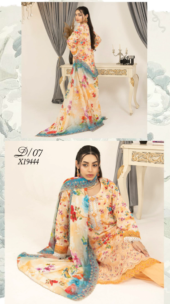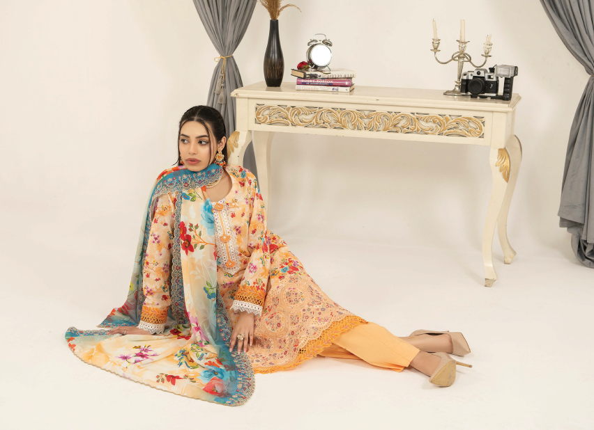 Upgrade your summer wardrobe with this elegant three-piece lawn suit, designed with a beautiful mix of digital print and delicate embroidery for a graceful everyday look.